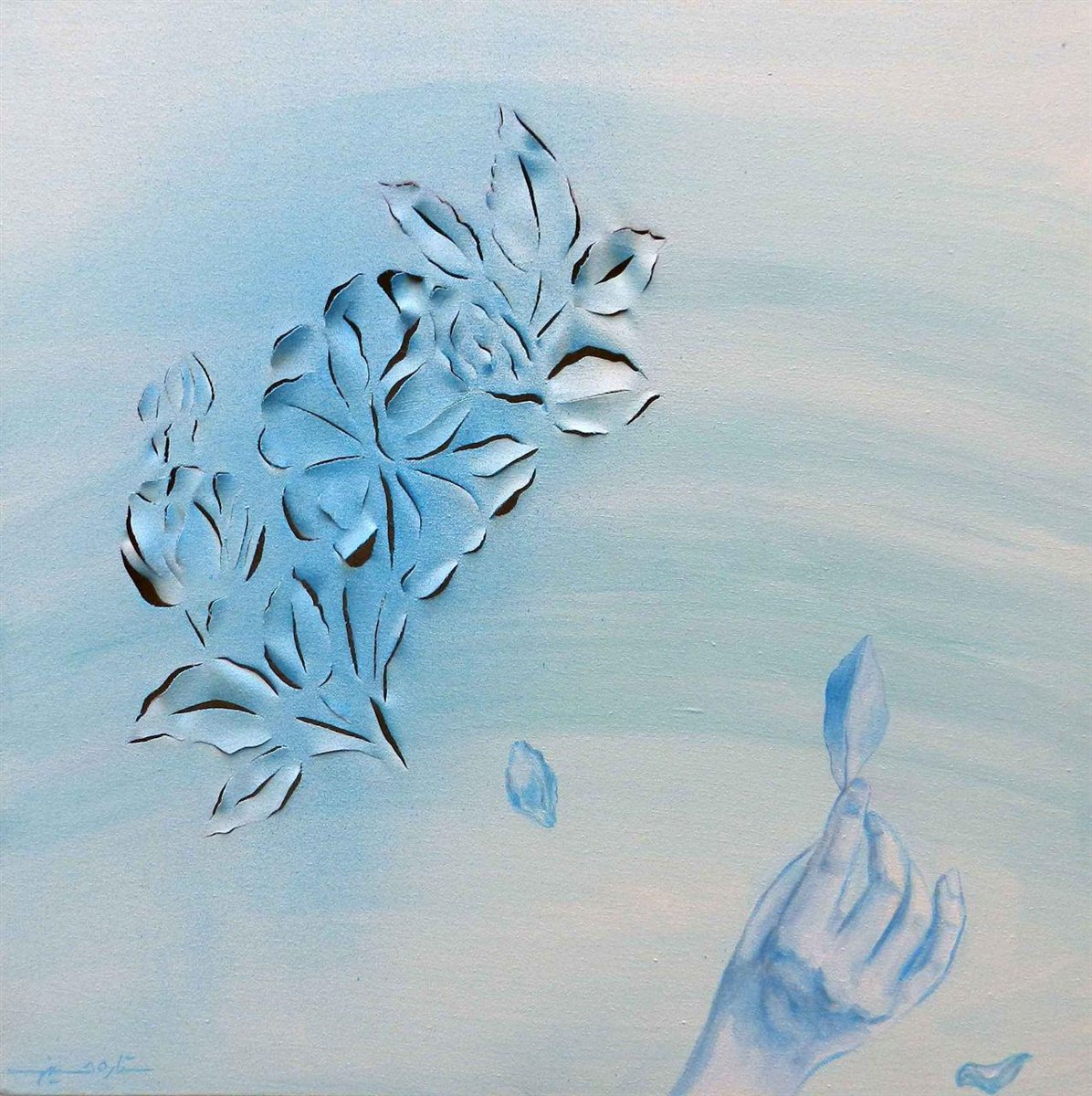 گلها نیز در کنار حباب و زن یکی از المانهای پر کاربرد هنرمند است. دکتر بهنام کامرانی به خوبی در بیانیه نمایشگاه درابره آثار گلها توضیح داده است؛