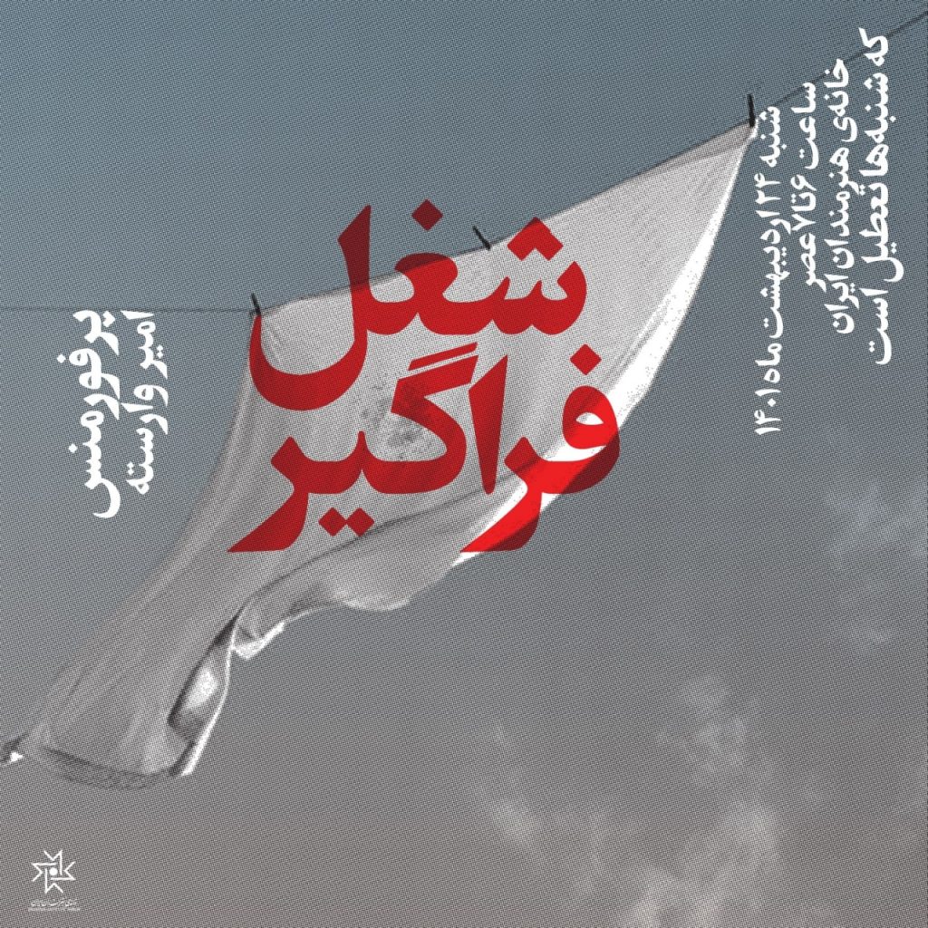 پیش از ورود به مدخلهای معنایی اجرای امیر وارسته تحت عنوان «شغل فراگیر»، لازم دیدم کلیتی از اجرا شرح داده شود. وارسته در فضای تماشاخانه ایرانشهر، درست در ورودی پلههایی که همواره معبر عبور عابران برای تماشای تئاتر و گاهی نمایشگاههای هنر تجسمی بودهاند، از پلهها پایین میآید و پارچههایی با لکههای سرخ را درون تشت آب فرو میبرد و مشغول شستن میشود. اما شستوشو به جای تمیزی به کثیفی بیشتر منتهی میشود، لکهها بیش از پاکشدن، منتشر میشوند، رنگها به جای زدودهشدن خودشان را به تمام سطح پارچه تکثیر میکنند و هر تلاش وارسته برای تمیزسازی و صورتیشویی به تلاشی عبث بدل میشود و او دست آخر پارچههایی با سرخی بیش از پیش را آویزان طناب میکند.
