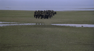 فیلم از همان ابتدا؛ فرصت می دهد تا مخاطب با تأمل به کشف – و گاهی باز کشفِ- همه ی کادر بپردازد؛ زیرا برای فیلمساز مهم است تا چینش کادرش درک شود و پیشزمینهی حسی مناسبی برای دریافتِ نماهای بعدی قرار گیرد. آب، که از همان اولین پلان فیلم حضور گسترده و مسلط خود را در پهنه ی داستان به رخ میکشد، بستر تمام این وقایع قرار می گیرد. حتی زمانی که شخصیتهای معصوم، ناگزیر از قدم گذاشتن در خشکی هستند؛ زمین گلی است و هنوز نشانه ای از آب را با خود دارد؛ بنابراین مهم است تا پلان اول فیلم آنچنان کش پیدا کند که قطرهقطرهی آبی که حائل آوارگان با دهکده است درک شود. در نشانهشناسی آب اولین تأویلی که به ذهن خطور می کند، پاکی و صداقت و آرامش است؛ بنابراین نباید تعجب کنیم که تمام شخصیتهای فیلم از معصومیت نهفته ای در درونشان برخوردار باشند. انگار شرط ورود به این دهکده و به تعبیری ساحتِ داستان، گذر از آبی است که در دین مسیحیت با آن غسل داده میشوید. آب همچنین گاهی وسیله است تا تقدیر با آن بتواند سرنوشتی را که ذات اهریمنی وقایع رقم میزند؛ با خود بشوید و هم چنان قدرت صافی و پاکیش را به رخ بکشد. با «اسپیروس» و پسر خردسالش «آلکسی» آشنا میشویم که به همراه عدهی کثیری از ایلوتبارش قصد اقامت در دهکده ای رادارند. آنها که از اودسا راندهشدهاند. «النی» دختر خردسالی را هم با خود آوردهاند که نشانی از هویت و خاطرات گذشته ی خود داشته باشند. منجیِ النی که او را از روی جسد مادرش در خیابان پوشکین برداشته، خود «اسپیروس» است که تنها چمدانی از گذشته با خود به همراه دارد. انتخاب شهر اودسا به خاطر تشابه لفظی با اودیسه؛ و خیابانی که «النی» از آن آمده – پوشکین- فیلم را به اسطوره های یونانی و شعر پیوند می دهد. آنجلوپلوس در فیلمهای قبلش نیز، چه ازلحاظ اجرای تئاتری و چه ازلحاظ ساختار داستانی، نشان داده است که چقدر خودش را مدیون تراژدی های یونانی میکند.